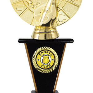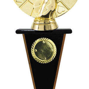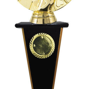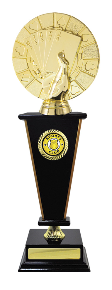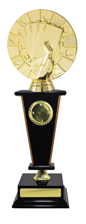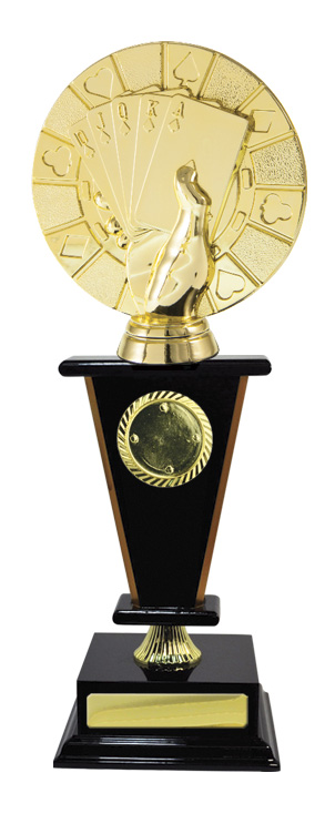 Distinguished by a gold hand holding a royal flush, this cards trophy captures the spirit of achievement in poker and card game competitions. The circular design integrates card suits for a memorable visual impact. A quality perpetual trophy for celebrating enduring card game success.