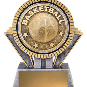 A stylish antique gold and silver resin basketball trophy featuring a detailed ball and hoop emblem framed by bold geometric lines. Its sturdy design and premium finish make it suitable for all levels of competition, from junior leagues to senior championships. Includes a gold engraving plate for personalisation.