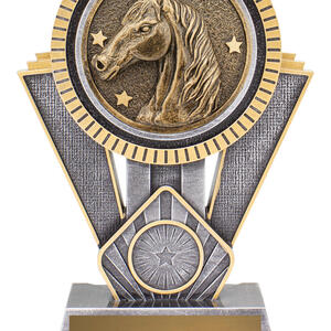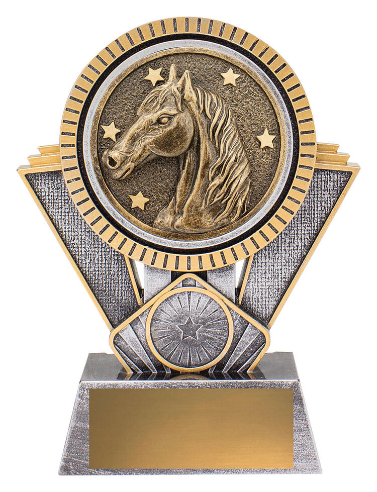 This version includes an additional star medallion at the base, enhancing the premium look. The antique gold horse head medallion sits atop a structured resin body, perfect for standout awards across all equestrian disciplines.