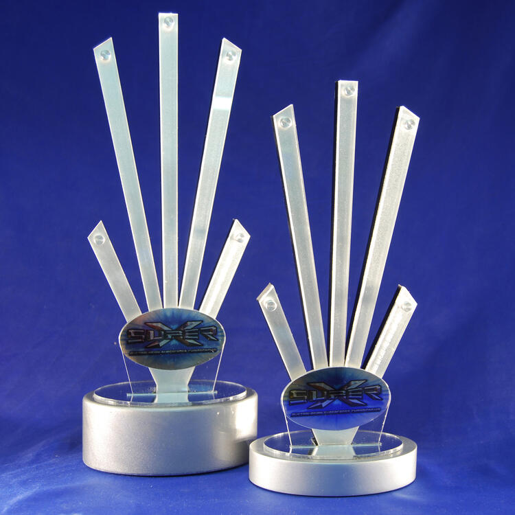 This striking Super X award is crafted in lumina style, featuring frosted acrylic panels rising in a fan like formation.