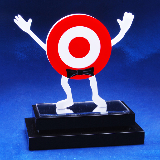 A fun and distinctive custom trophy created from layered cut out acrylic in the shape of the Target logo character. Mounted on a polished black acrylic base, this award captures the brands energy with its bright colours and playful form . Ideal for retail recognition, corporate milestones, or promotional events.