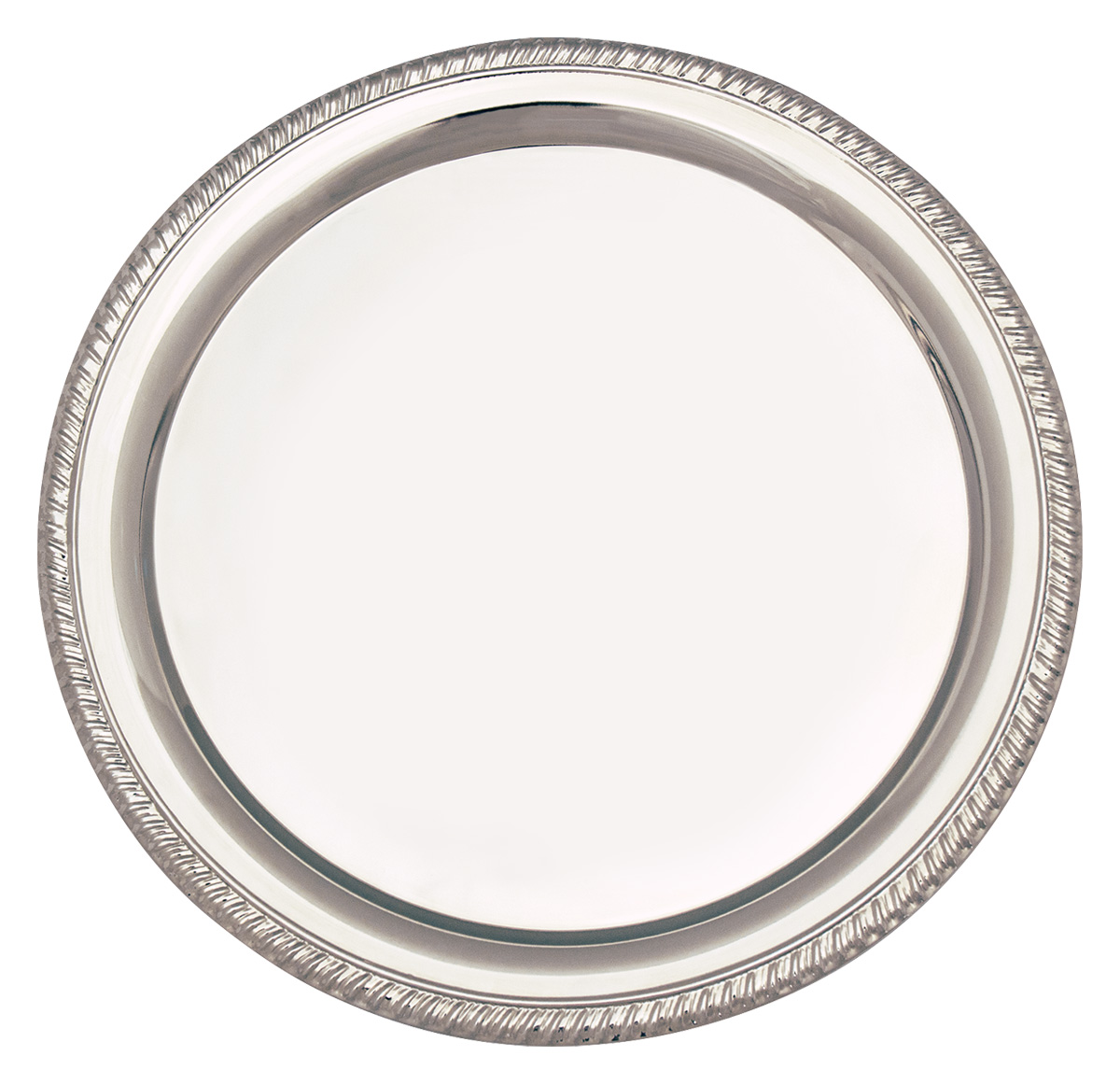 This nickel-plated silver tray is a lightweight, budget-conscious item with a bright, polished finish and decorative edging.