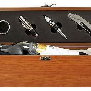 Crafted for occasions that call for distinction, this wine gift box combines refined materials and thoughtful presentation. The rectangular design in Cherry finished timber, black, and silver houses your bottle of wine bottle alongside essential accessories like a corkscrew and wine stopper. Durable wood, sleek metal, and clear glass come together to create a memorable, practical piece for professional or celebratory gifting.