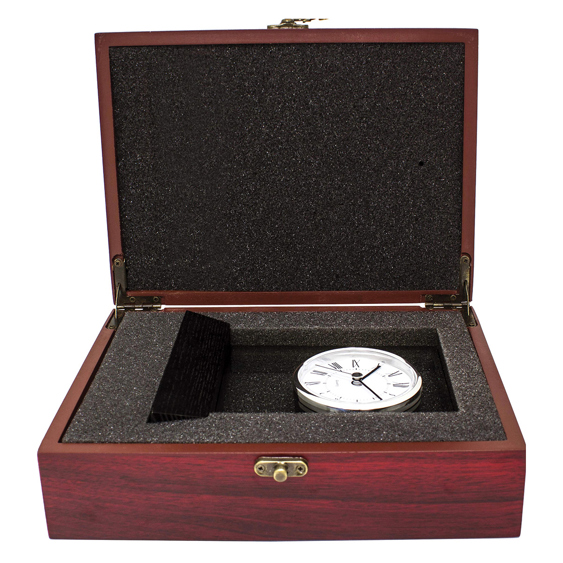 Premium rosewood presentation box with foam insert designed for a hip flask set. Features a protective black foam interior and secure brass clasp. An elegant packaging choice for corporate or commemorative gifts.