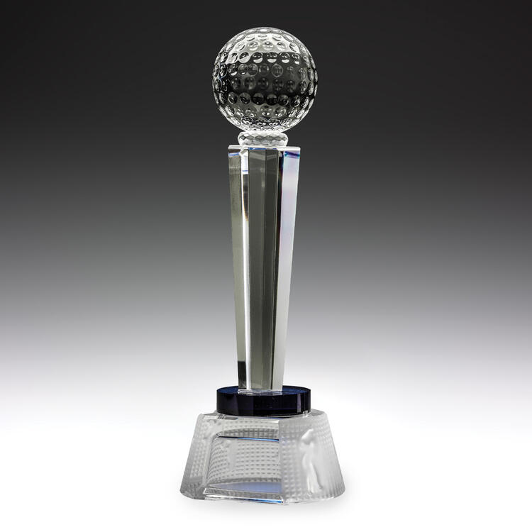 Crafted from quality crystal in clear and black, this golf trophy captures the spirit of achievement on the green. Its trophy like silhouette features a detailed golf ball at the top, set above a textured base that adds an elegant and professional finish. A refined choice for commemorating excellence in any golf event.