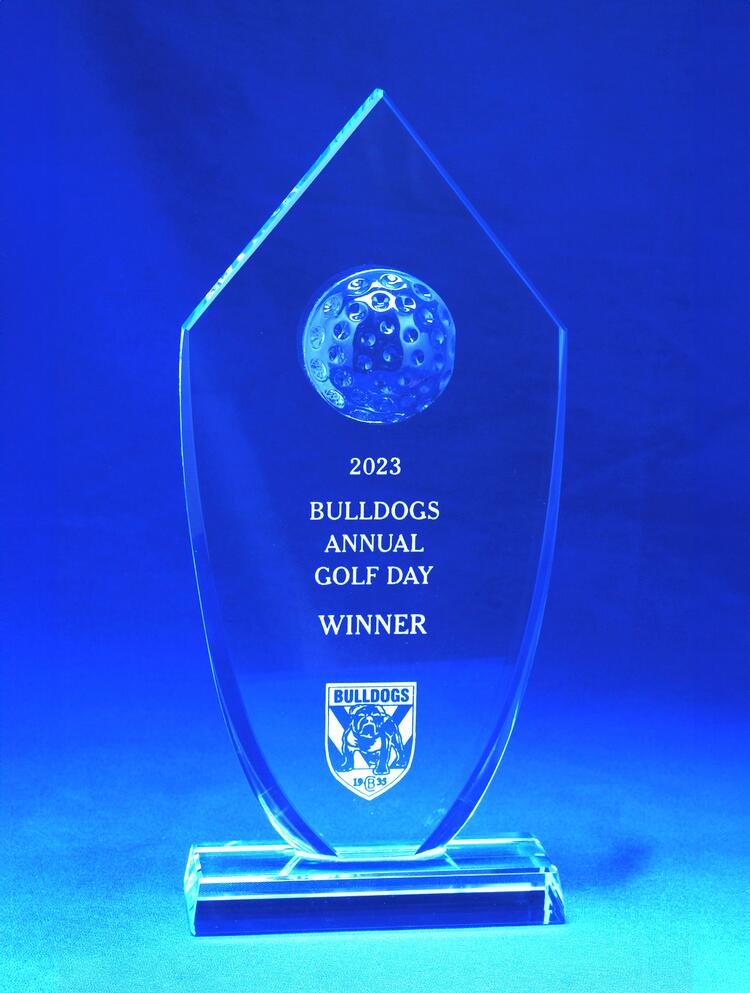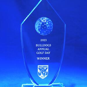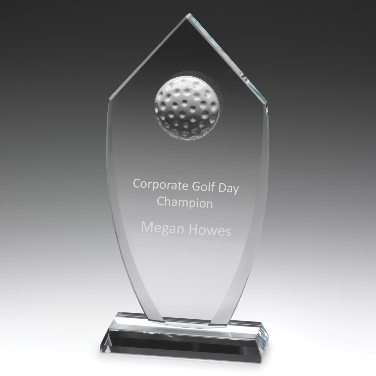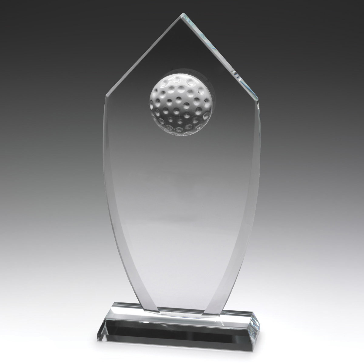 This clear glass golf award brings elegance and distinction to any recognition event. The shield like design with a pointed top is complemented by a striking 3D golf ball feature, making it a fitting choice for golfing achievements. Set on a sturdy rectangular base, it offers a professional and memorable presentation for players and teams.