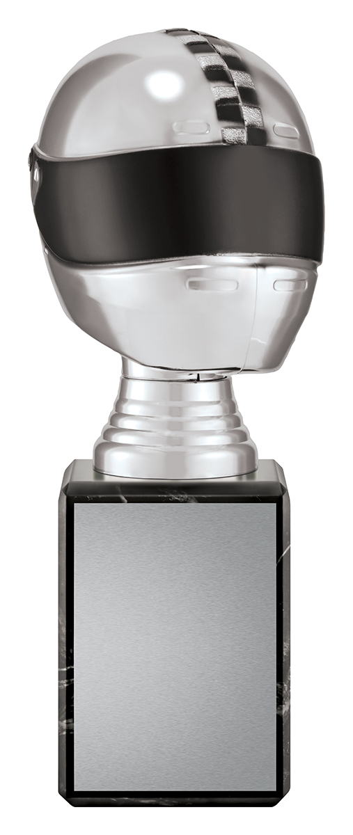 Crafted for motorsport distinction, this silver helmet trophy features a dynamic helmet shaped top with a bold chequered stripe pattern. Its silver and black finish, paired with a blend of plastic and resin materials, delivers a sense of quality and durability. The exclusive design celebrates racing achievement, making it a trusted choice for professional motorsport recognition.