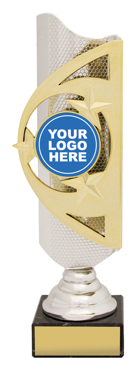 Crafted with a striking blend of gold, silver, and black, this contemporary trophy features a bold curved silhouette on a sturdy rectangular base. Its unique 50mm circular centre is designed for effortless customisation, offering a professional platform for celebrating achievement in motor sports trophies or any general sports event. Durable marble and plastic construction ensures lasting recognition for every milestone.