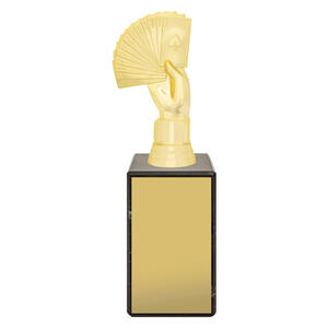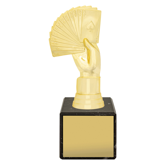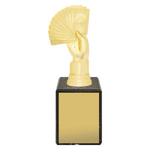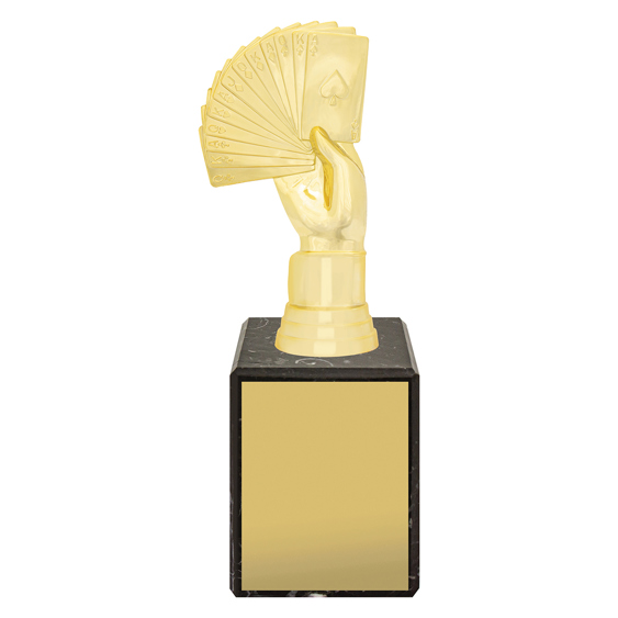 This Victory Cards Trophy features a classic fan shape with the four card suits displayed in bold gold and silver detail. Mounted on a marble base with ample engraving space, itÂ’s perfect for poker nights and card competitions.